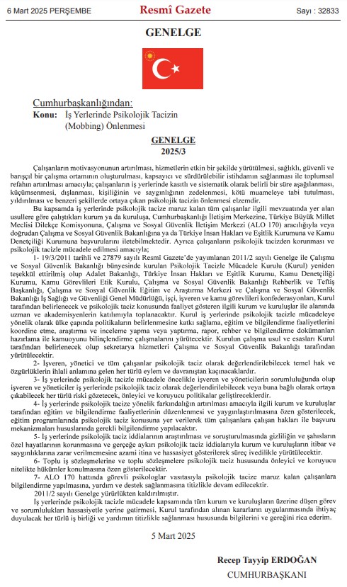 Çalışma hayatında psikolojik tacizin önlenmesi amacıyla hazırlanan Cumhurbaşkanlığı Genelgesi, Resmi Gazete’de yayımlanarak yürürlüğe girdi. Yedi maddeden oluşan genelge, iş yerlerinde sağlıklı bir çalışma ortamı oluşturmayı ve çalışanların haklarını güvence altına almayı hedefliyor.