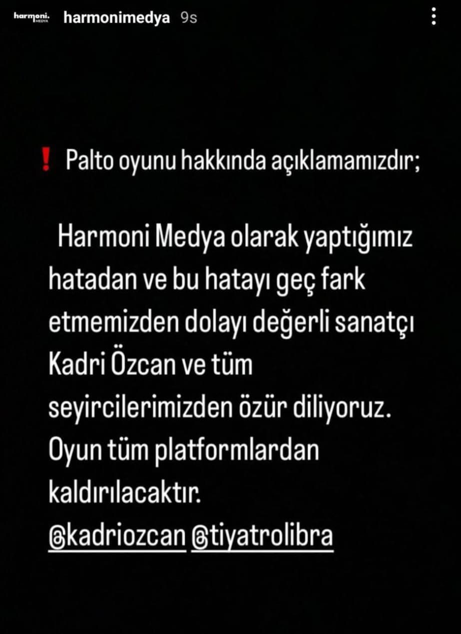 Harmoni Medya’nın Kadri Özcan’ın Palto oyununu sahneleme girişimi sosyal medyada geniş yankı bulunca Harmoni Medya sosyal medya hesaplarından aşağıdaki paylaşımı yapmış ve yaptıkları eylemi “hata” olarak nitelendirmişler.